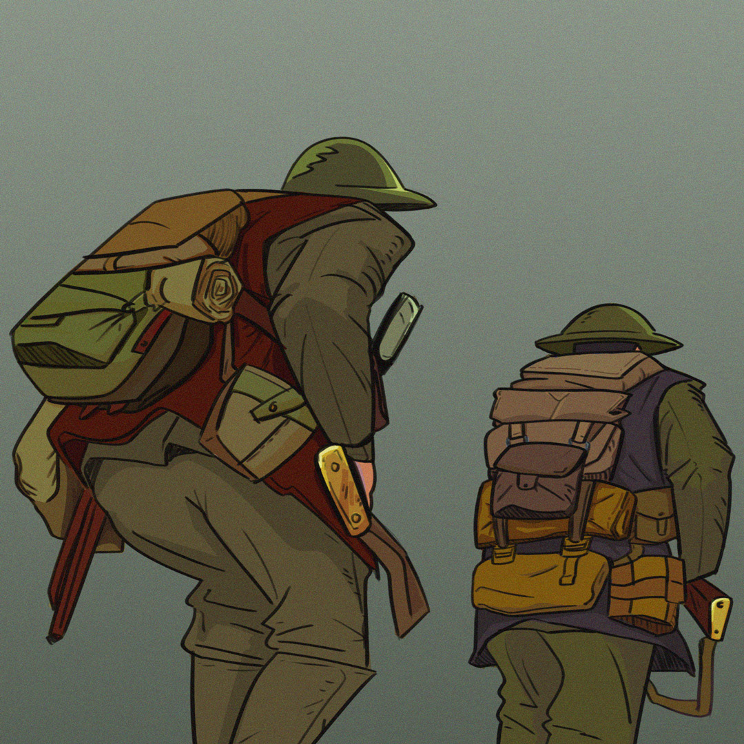 Loved the costuming in 1917 and wanted to illustrated a piece that highlights the various layers of stacked equipment: straps, packs, pouches, canteens, and so on.
